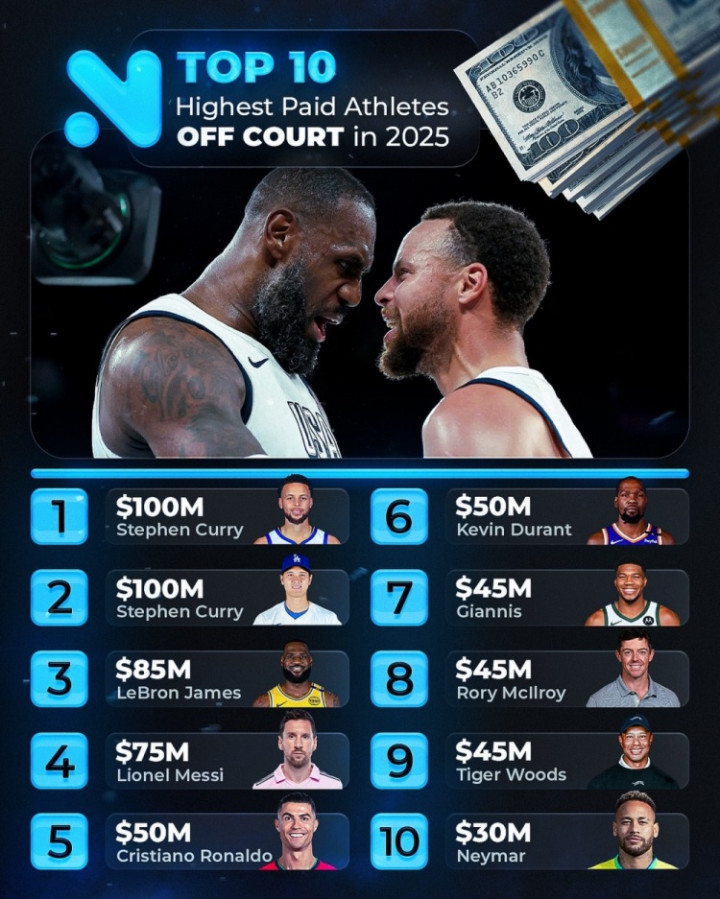 37岁库里在场外的影响力巨大,2025年场外收入高达1亿美元,力压众星位居第一位;除了库里之外,詹姆斯、杜兰特和字母哥也排在前十榜单上。